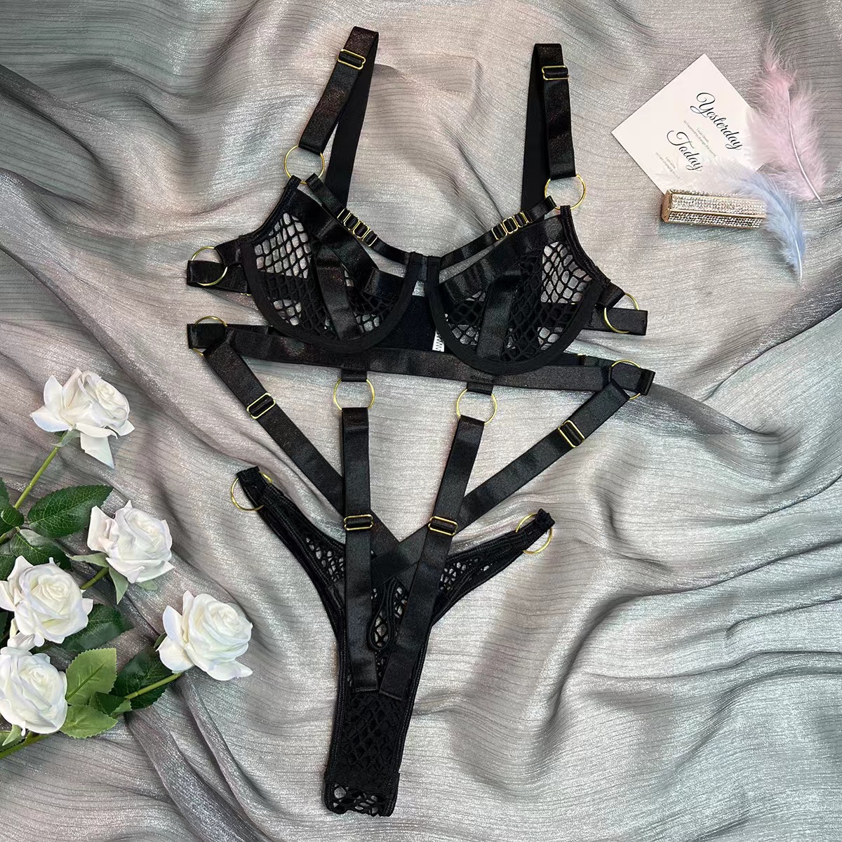 Ladies' sexy lingerie fishing net hollowed out sexy perspective metal ribbon splicing conjoined underwear.